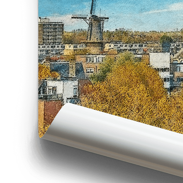 There is no city in the Netherlands with as many historic windmills as Schiedam. In this impressionistic digital painting, made with thick splotches of virtual paint, we see four of them rising above the houses and trees of the town centre. In the foreground the recently restored windmill De Walvisch, behind it from left to right De Drie Koornbloemen, De Vrijheid and De Noord.