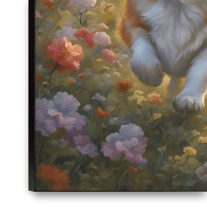 This vibrant and whimsical digital art piece captures the joy of an Pembroke Welsh Corgi playing in a field of wildflowers. The dog's playful expression and energetic body language are perfectly captured, and the bright and cheerful colors of the flowers create a sense of happiness and carefree fun.
