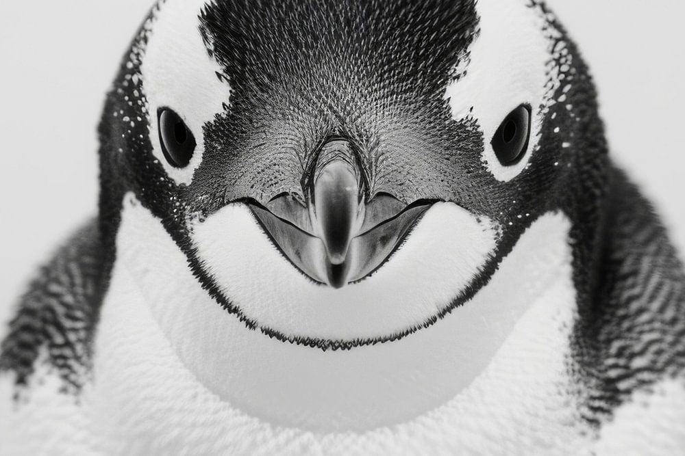 This impressive black and white portrait of a penguin perfectly captures the majestic elegance of the animal. The minimalist composition and the fine details of the feathers create a harmonious and calming effect. Ideal for lovers of nature and photographic art, this artwork will bring timeless beauty to your home.