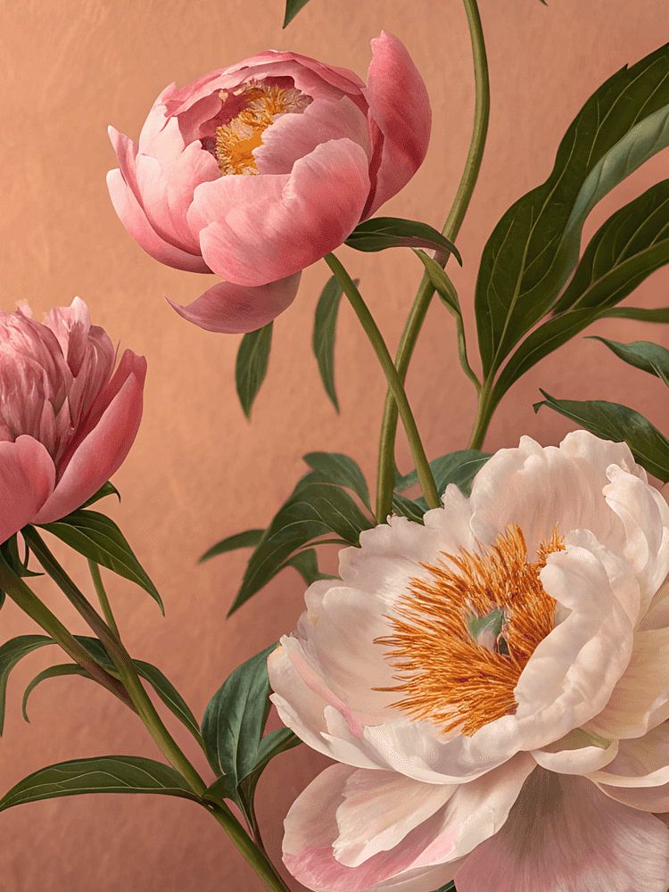 The image features a still life of pink and white peonies against a textured, warm-toned background. Several blooms are in various stages of opening, from tight buds to fully open flowers. The petals exhibit delicate shades of pink and white, with some having a creamy, almost translucent quality. Green leaves provide a contrast to the soft colors of the flowers.