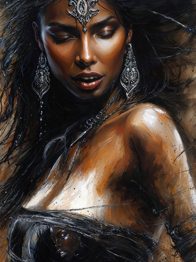 The details in her costume and jewellery emphasise her majestic appearance. The dark tones of her clothes contrast beautifully with her warm skin, creating a sense of mystery and allure. The sinuous lines and textures around her figure suggest an energy surrounding her, accentuating her dynamism and vibrancy.