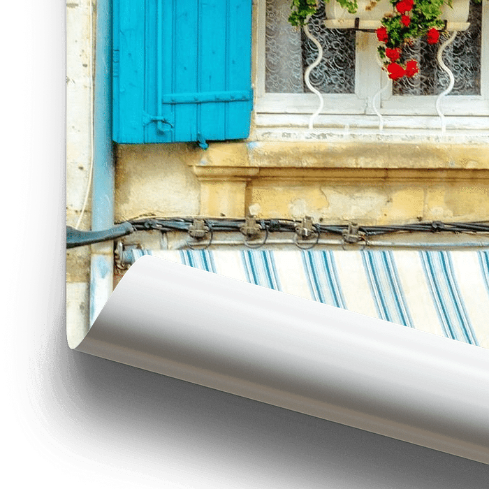 Typical French Provencal style windows with blue shutters and flower boxes. Also the sun protection and the color of the wall is very recognizable for Provence.