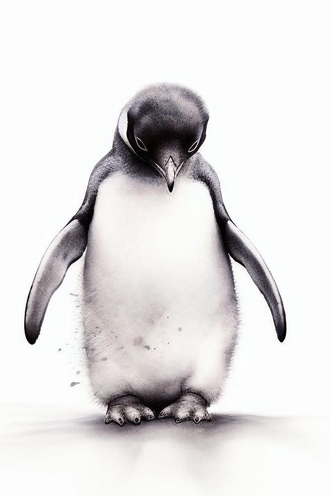 A simple, yet charming pencil drawing of a penguin looking down sadly. The lines are minimalist and clean, focusing attention entirely on the penguin's pose. On a white background, the simplicity of the artwork comes to life, and the subtlety of the drawing exudes a sense of serenity.