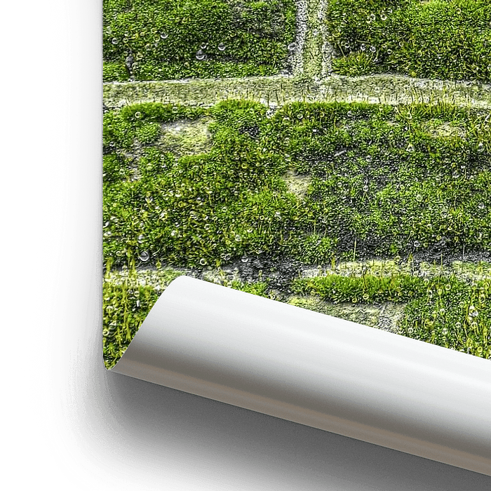 The rain has left its traces on this brick wall in Amersfoort, the Netherlands. Stones and grouting are still damp and water droplets are suspended from the moss. The wealth of colors of the weathered stones and the erratic patterns of different types of vegetation make this a kind of abstract artwork, created by time.