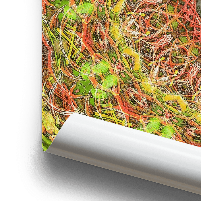 A kaleidoscopic work in the rasta colors red, yellow and green, based on a photograph of the budding flowers of a rhododendron in the spring.