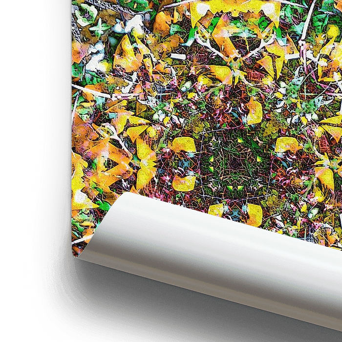 A kaleidoscopic image with a strong symmetry and a great wealth of colour shades, based on a photograph of red berries against a background of trees in autumn colours.