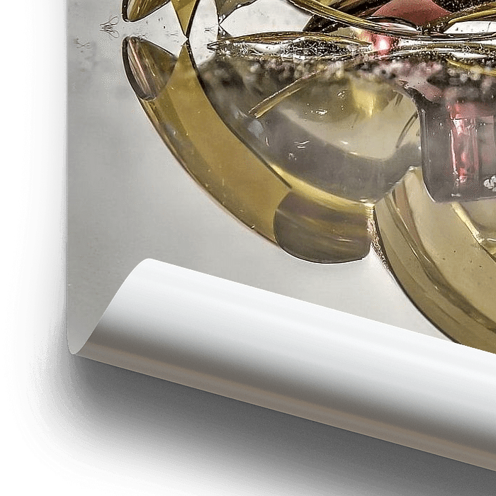 The shards of broken two Christmas baubles, one golden and one red with a gold motif, both silver on the inside, carefully arranged on a mirror and imaged with the focus-stack method, which ensures every detail is in focus. A fascinating play of color, form, light and reflection.