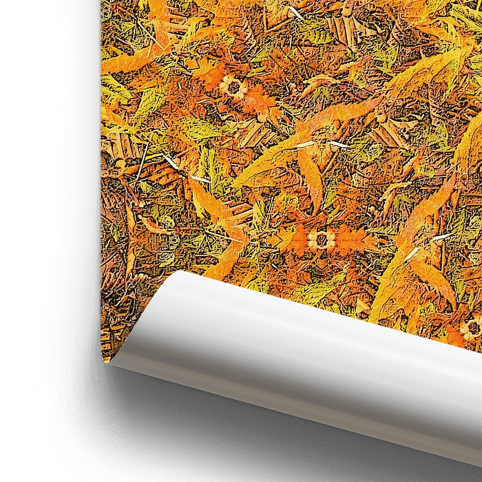 A kaleidoscopy is an adaptation of a photograph of a flower, leaf or other "natural phenomenon". In this case, the work was based on a photograph of a number of fallen autumn leaves.