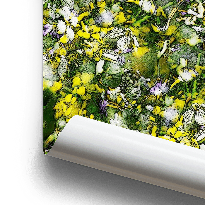 A colourful and lively work, created by transparently overlaying seven copies of a photograph of wildflowers in bloom along the side of the road on a beautiful summer's day.