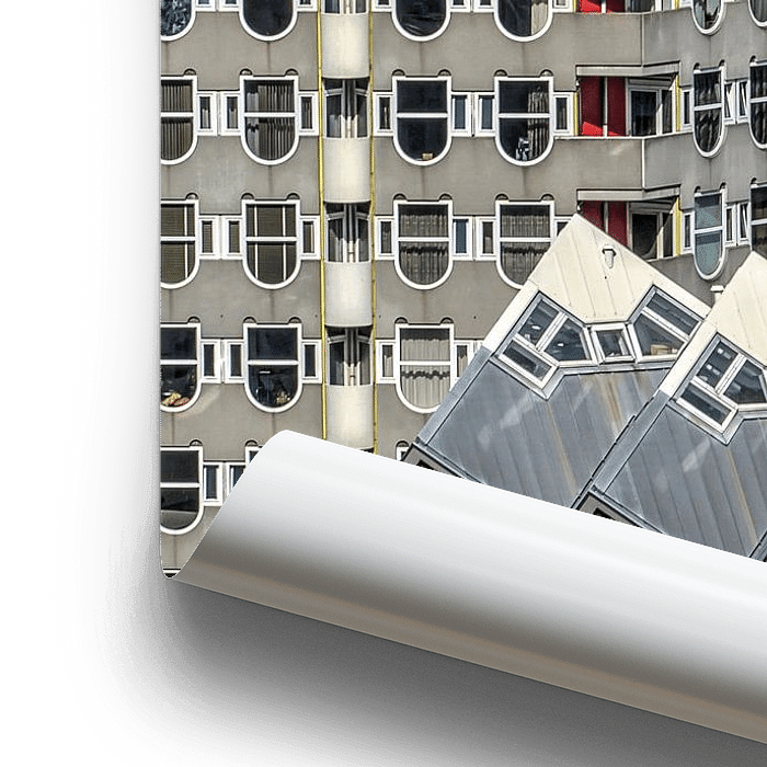Three famous buildings from the eighties in the center of Rotterdam can be seen in this collage-like photograph in colors reminding of Piet Mondriaan: on the left residential tower the pencil, designed by Piet Blom, at the bottom the cube houses by the same architect, in the middle the Library, designed by the office of van den Broek and Bakema.