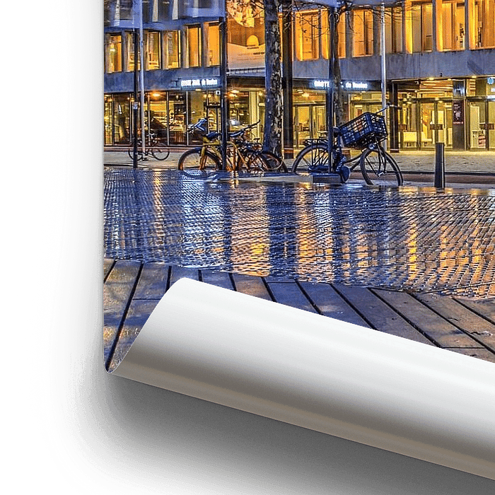 At this early evening in December, the building reflects in a wet Schouwburgplein (Theatre Square), also known as the Iron Square, although are also a lot of wood and other marine materials are used in it. The square was laid out in the nineties to a design by Adriaan Geuze's West 8 Landscape Architects .