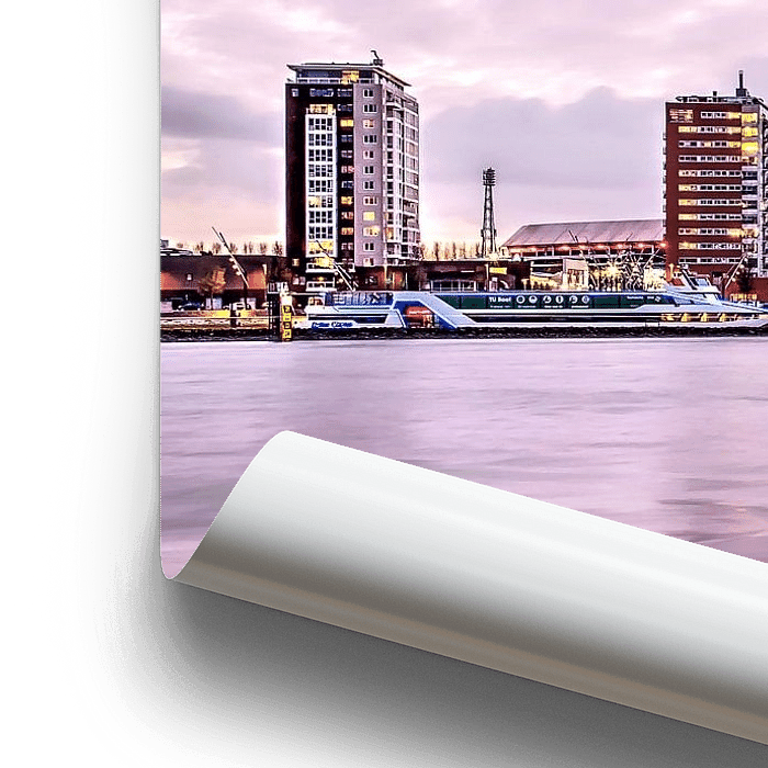 An evening view of the Rotterdam district De Veranda, the former Piet Smit shipyard, located on the banks of the river Nieuwe Maas, with stadium De Kuip, the home base of football club Feijenoord, in the background.