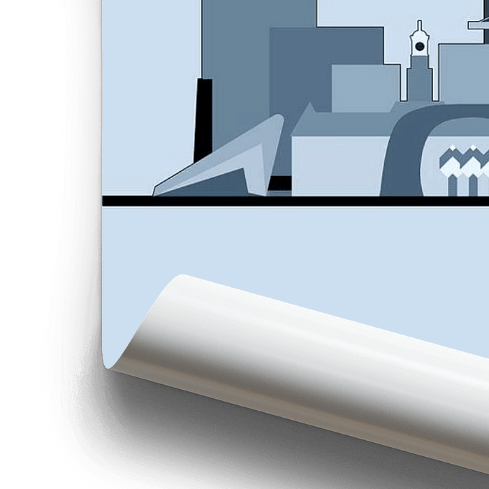 The graphic skyline of Rotterdam can be found in different editions in this shop. This is a version in which the towers, cranes and bridges are depicted in shades similar to Bright Skies, in September 2021 proclaimed by Flexa as color of the year.