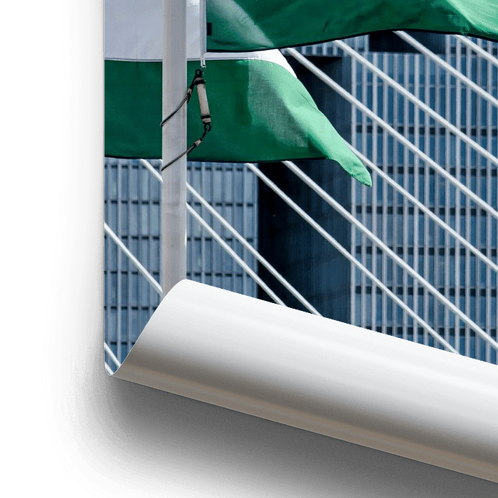 The Rotterdam flag on Boompjes boulevard along the Nieuwe Maas river. The green-white-green symbolises the river Rotte that flows between meadows. In the background, blanketed but recognizable, we see the struts of the Erasmus Bridge and the facade of De Rotterdam.