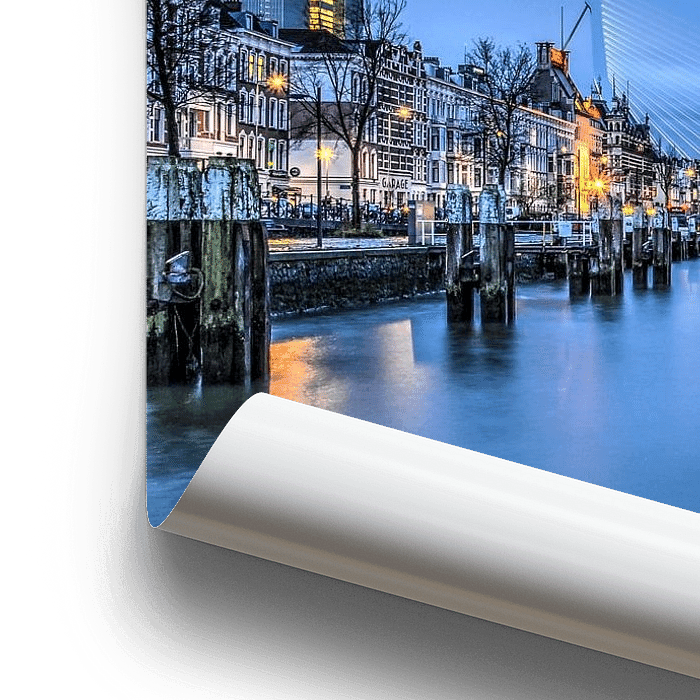 We see here on the right a number of residential and office towers on Boompjes Quay, with behind it the town center. On the left we see the Noordereiland, or North Island, which is located in the middle of the river. Behind it the building De Rotterdam and Erasmus Bridge are visible. In the background that other icon of the city, the Euromast observation tower, can still be seen.