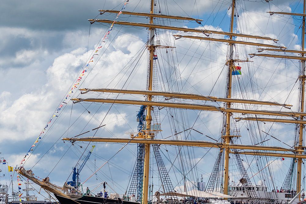 A Russian four-master leaves the port of Delfzijl on the sun-drenched final day of Delfsail 2016 accompanied by a series of smaller ships.