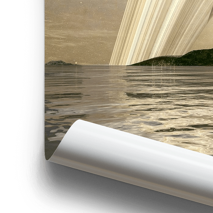 An scenic image from a distant future on the planet Venus, which after a long terraforming project has been transformed into a true sister planet of the Earth. On a warm evening, a small yacht sails on a calm sea from island to island. The scene is illuminated by the Rings that surround the planet, partly shaded by the planet itself. High in the night sky is a bluish "star": the Earth.