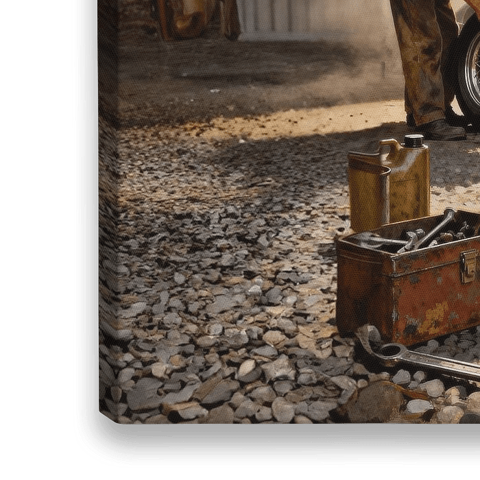 The image captures a silver vintage Porsche 911 parked in a rustic, atmospheric garage. Gleaming with a polished finish, the car commands attention with its iconic round headlights and wire wheels. The right front corner is propped up by a weathered orange hydraulic jack, while a mechanic, clad in brown workwear and a flat cap, crouches…