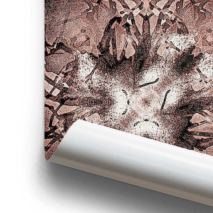 An abstract kaleidoscopic image in brown and white tones, based on a winter photo of branches covered with fresh snow.