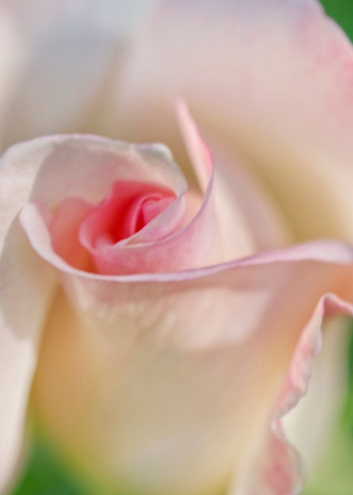 Soft Pink Rose on Green - a soft pink rose blooming on a early cool fall morning. The blossom looks prestine having no petsts to bother her. The blossom is a soft almost white pale pink. The fall sun is skimming the flower from the right. The background is a bright medium osft blue green. The view is at about 45 degree allowing a view into the core of the rose.