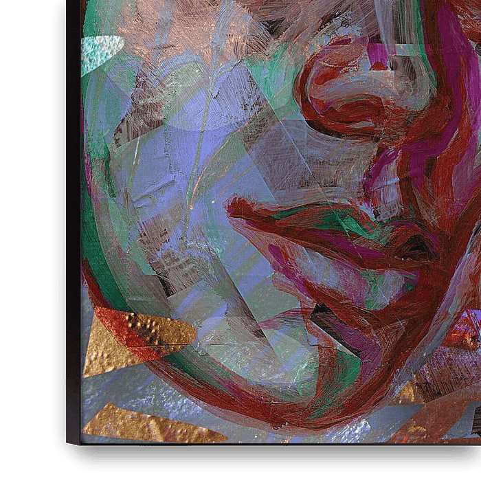 Kunstwerk met 2 gezichten die vredig kijken, intense diepe kleuren en doorwerkte details uit veel lagen opgebouwd.