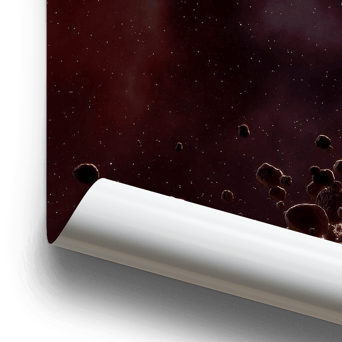 A sci-fi image with a planet, a moon and a belt of asteroids in landscape format.