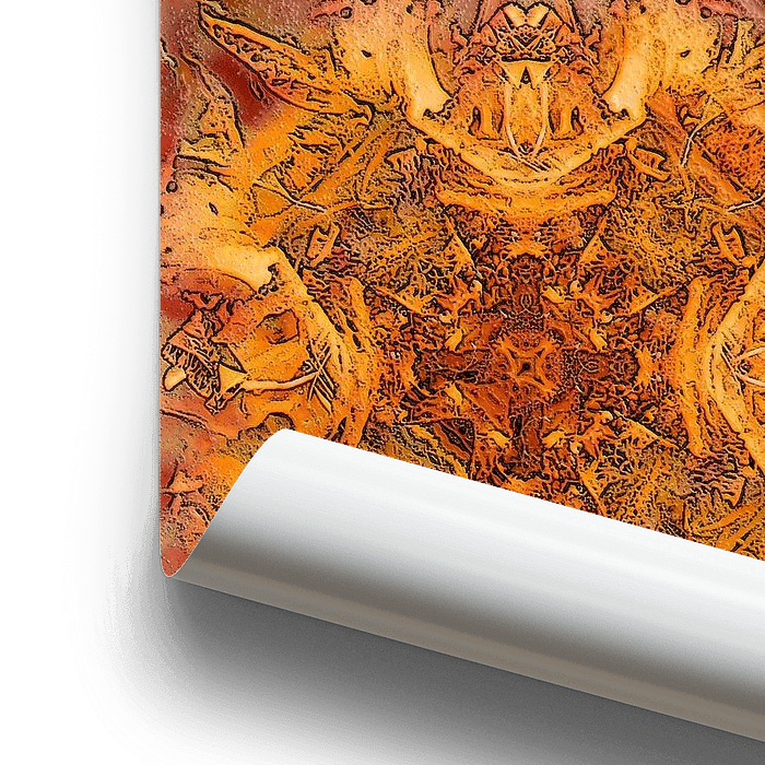 An abstract kaleidoscopic image in warm shades between yellow and red, with a hint of purple, based on a photo of several rhododendron flowers in spring.