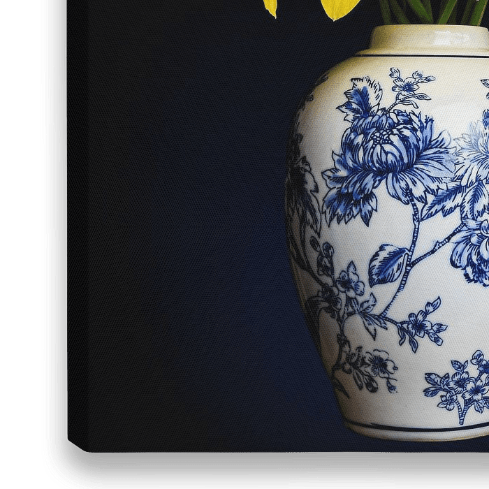 Buy this flower art Still Life Daffodils in Delft Blue by By Marjolein Design on canvas, ArtFrame, poster and wallpaper, printed on demand in high quality.