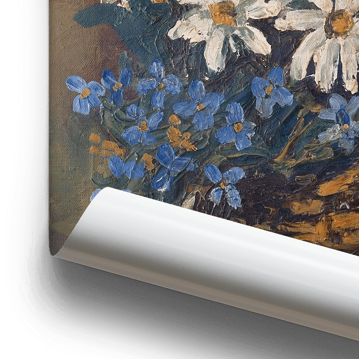 Buy this flower art Still life with daisies and blue flowers in a basket. by Galerie Ringoot on canvas, ArtFrame, poster and wallpaper, printed on demand in high quality.