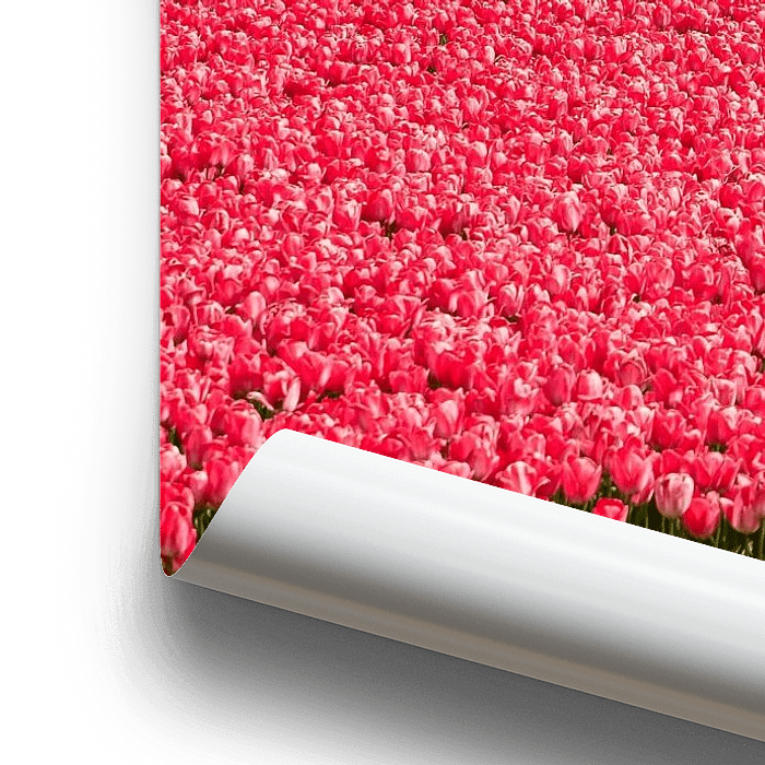 An almost surrealistic image from near Lisse, the Netherlands; industrial agriculture with a field of red tulips against a background of greenhouses.
