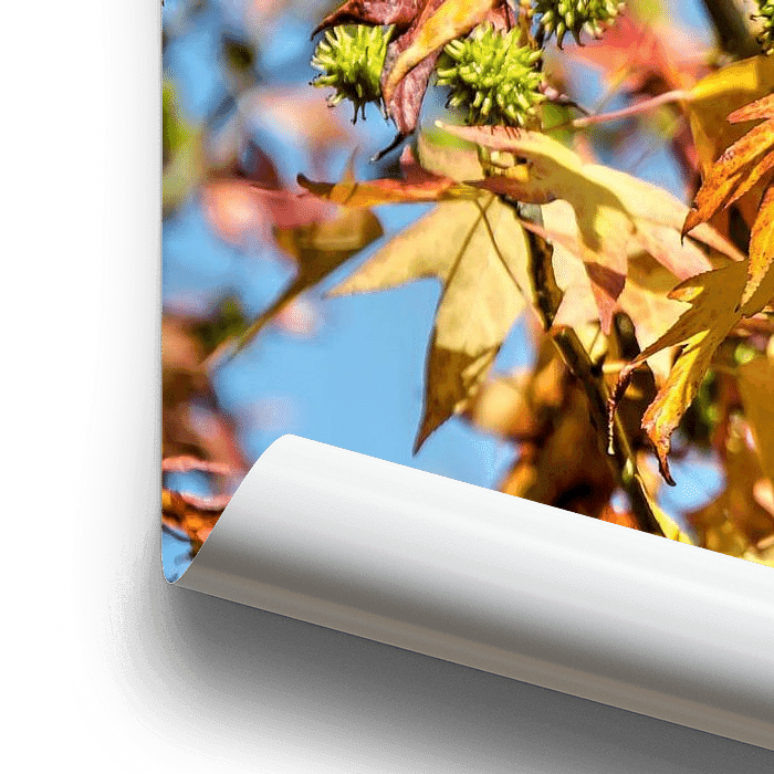 Liquidambar styraciflua, or sweet gum tree is a striking appearance in the fall. The red leaves and the green, prickly fruits, together with the blue sky, create a colorful, festive image.