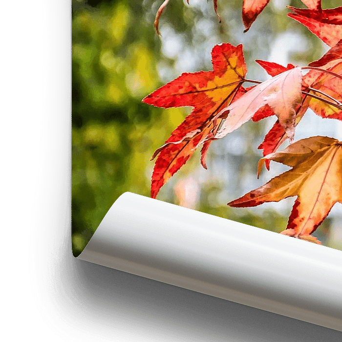 The red, star-shaped leaves of a sweet gum tree (liquidambar styraciflua) in autumn in the Park in Rotterdam, with the Parkflat at Kievitslaan in the background.