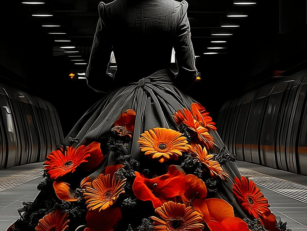 Woman in black top and huge floral dress in a dark underground corridor - surreal fashion art.
