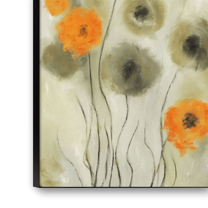 A variety of flowers are depicted in a stylized fashion with long, flowing stems against a mottled beige background. The whimsical nature of the floral arrangement gives the piece a dynamic and organic feel.