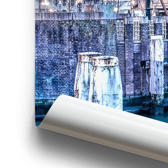 Mooring posts and quay walls, historic barges and extravagant architecture from the nineteen eighties, all reflecting in the smooth water of the Old Harbour in Rotterdam on a morning in January.