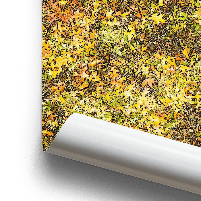 A very lively and colourful work in the autumn colours red, orange, yellow and green, based on a photo of the foliage of an oak tree on a sunny day in October.