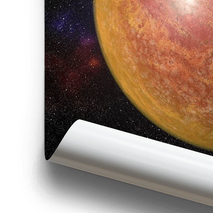 This artist impression of a somewhat mysterious orange planet is a follow-up to the visualisation of the planet Night Watch, found elsewhere in my webshop. That celestial body orbits, at 910 million light years from Earth, the star Starry Night.