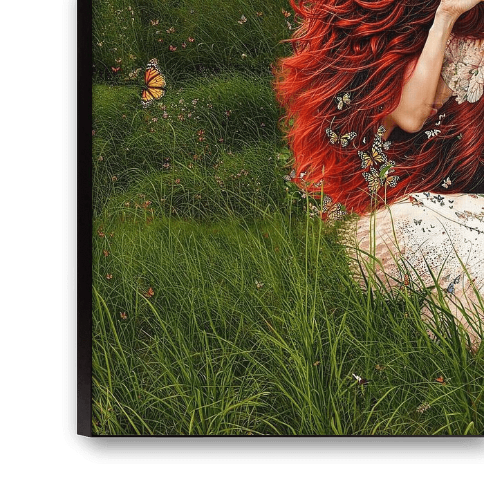 A dreamy and enchanting artwork in which a young girl with fiery red curls plays with a swarm of butterflies in the tall grass. Her innocent gaze and gentle posture symbolise the purity and wonder of youth - the time when the world still seems full of magic.