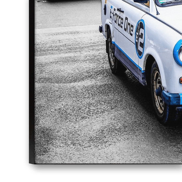 Electric Trabant from Trabiworld.com drives through Friedrichstrasse at Checkpoint Charlie in the centre of Berlin. Behind this Trabant two other Trabants run on petrol. On the other side of the street three taxis are parked with the characteristic beige color. This picture was taken in the summer of 2019.