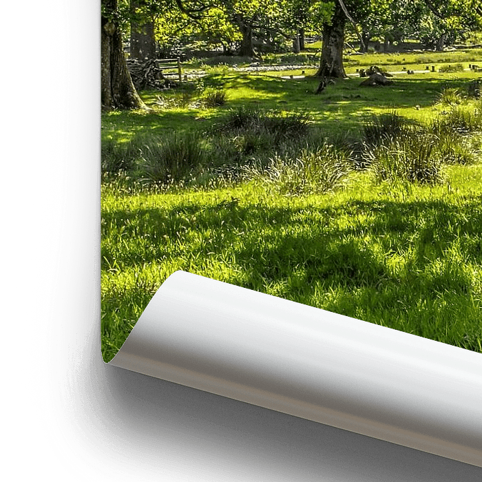 The sun is shining through the branches of an oak tree in the English Lake District National Park, a park-like landscape in springtime.
