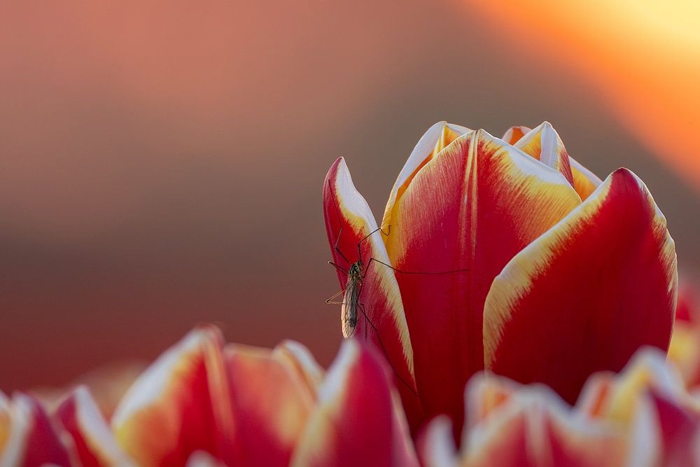 On a sunny spring evening, I was treated to a sunset behind a vast tulip field. The colours of the tulips blended beautifully with the hues in the sky, creating a magical spectacle. While admiring this scene, a tiger mosquito quietly perched on one of the tulips caught my eye.