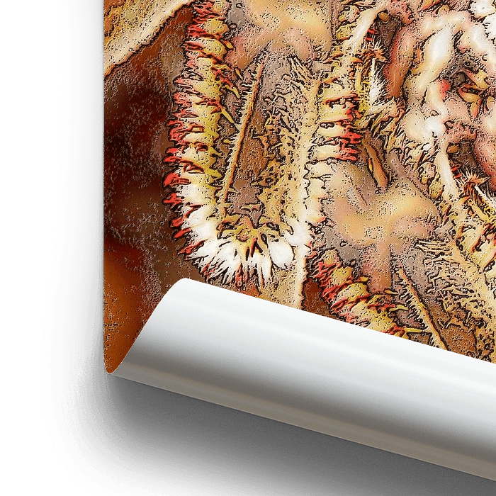 This digital artwork is based on a photograph of willow catkins, taken during a trip through Iceland. A special kind of willow catkin, with red dots. By superimposing that photo in eight transparent layers, each layer rotated 45 degrees from the previous one, this image was created.