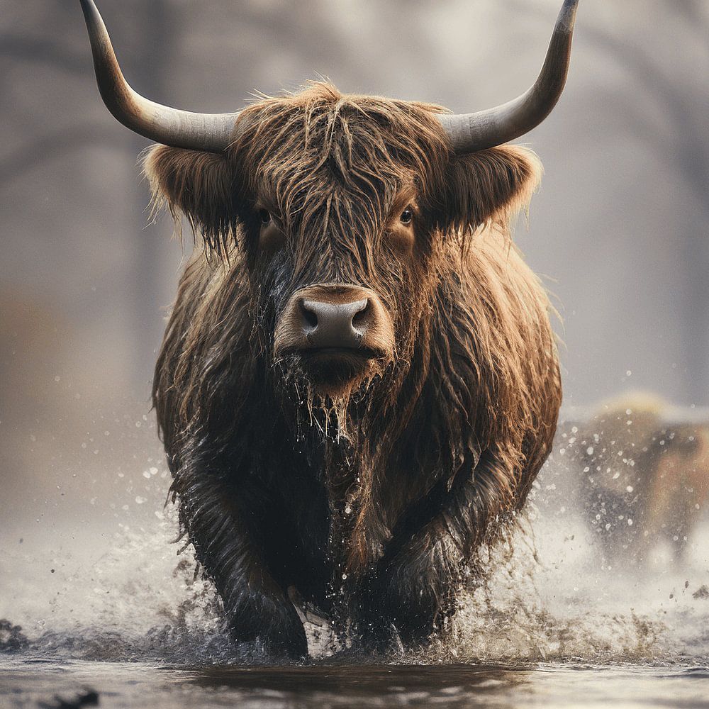Experience the majesty of nature with 'Water Feet' where an imposing Scottish Highlander walks gracefully through the water. The animal's strength contrasts beautifully with the serenity of its surroundings, while water droplets glide off its fur like pearls. An iconic moment of serenity and strength all in one.