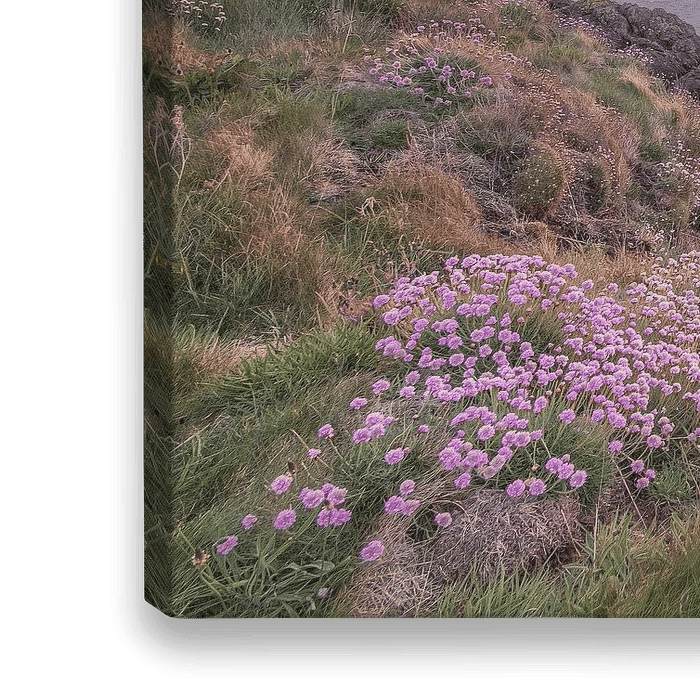 On a beautiful morning on the south Scottish coast, when the earth slowly awakens. A beautiful scene of a rugged coastline at Eyemouth, with wild flowers in the foreground.