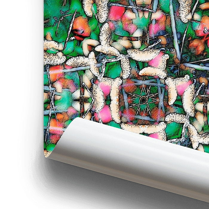 A kaleidoscopic image with a harmonious symmetry, based on a photograph of fluffy white flowers against a multicolored background.