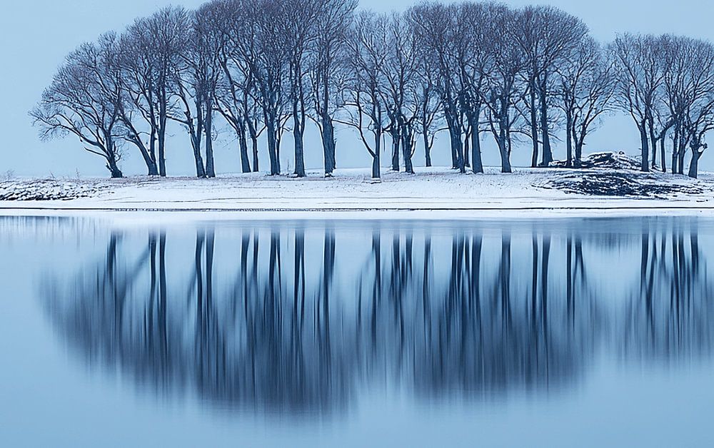 Row of bare trees on an island in icy blue water, with perfect reflection - serene winter wall decoration.