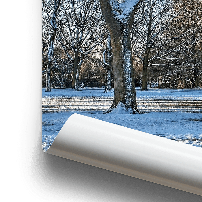 A wintery image from the park near the Euromast, also simply called The Park. There is snow on the meadow, the sky is blue, a tree appears to embrace the Euromast with its branches.