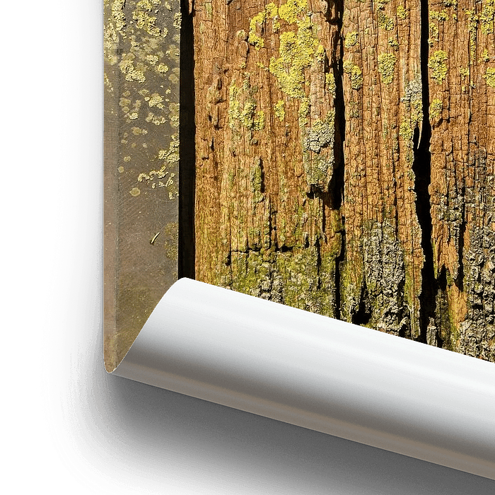A compostition with both dead straight and jagged vertical lines and of shades of brown, green and grey. A weathered mooring pole in the harbour, covered in lichen, sandwiched in a steel frame to which the ravages of time have not gone entirely unnoticed either.