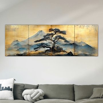Mountain landscape with golden sky and pine tree Japandi panorama by Digitale Schilderijen
